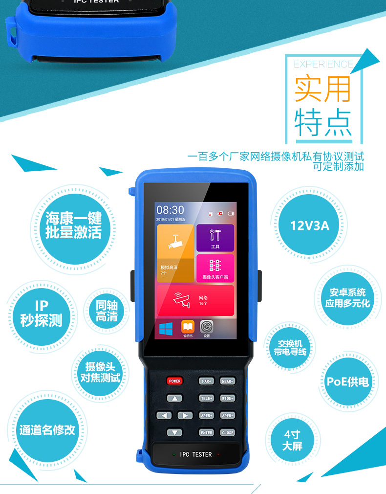 首家采用4.3寸800*400全视角电容式触摸屏/内置ONVIF工具/海康、大华等四十多种私有IPC图像测试/移动客户端视频/ 12V直流输出,最大电流3A,为摄像机临时工作电源/ 无线WIFI,网线TDR质量测试 测试网线对状态、长度、衰减、质量、阻抗、延时偏离等参数,48V PoE电源输出,最大功率25.5W,