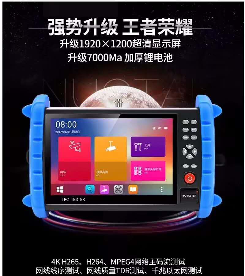IPC测试仪是网路通公司专门针对高清网络摄机安装和维护而研发的测试工具,它同时兼顾了模拟监控快球和摄像机测试,以及视频电平测量、模拟和数字视频信号输出、POE电压测量、IP地址扫描更改、PING、端口闪烁、网线测试、万用表、光功率计、红光源故障定位、SDI测试、寻线功能、TDR线缆断点和短路测量、电容屏触摸和按键2种操作方式、图像180度旋转等更多实用的测试功能,更加易用快捷。内置7.4V聚合物锂电池,容量3000mAh,可使用8-10小时(红字为选配功能,需另外费用)